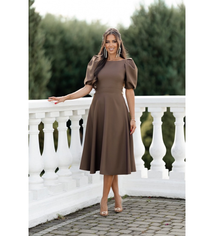 Kokarda w talii stanowi kluczowy akcent, który nadaje sukience romantycznego charakteru, a delikatne rękawki sprawiają, że model prezentuje się niezwykle szykownie.